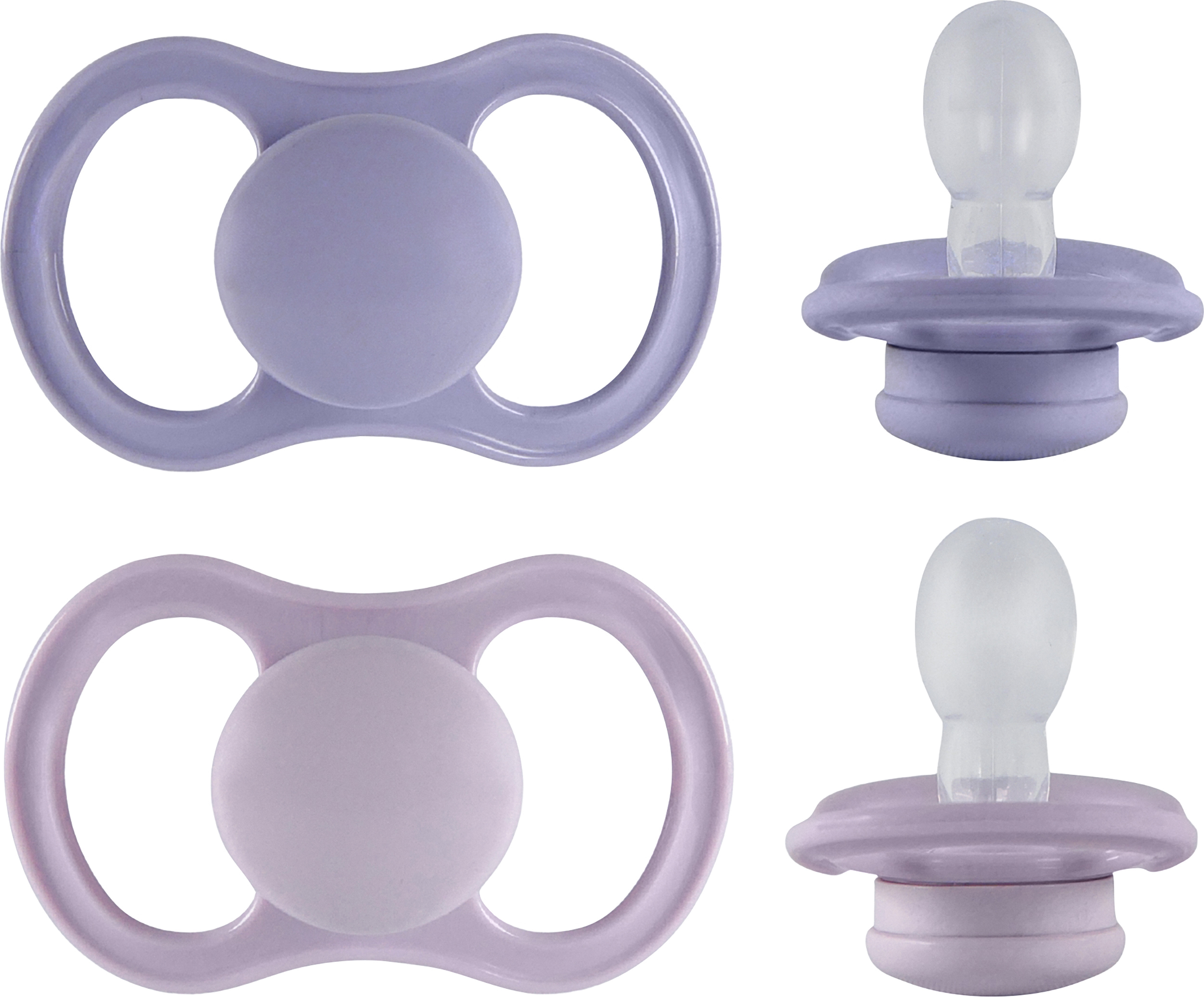 Tack vare symmetriskt formad sugdel är Happy - Quiet Violet/Morning Lily alltid rättvänd i barnets mun.