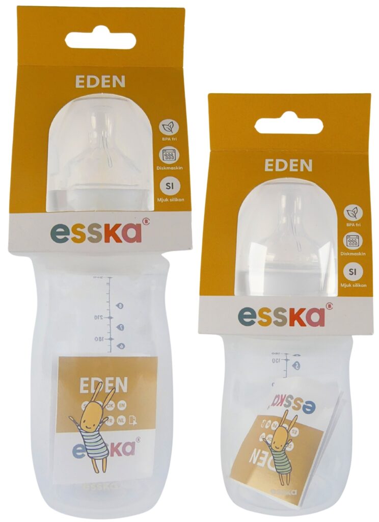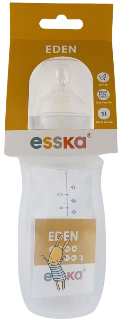 ESSKA EDEN nappflaskas neutrala färger passar många. Flaska och lock har tydlig gradering som underlättar att mäta upp rätt mängd. Läckagesäkert lock kan användas som måttskopa. Nappflaskan har en bred öppning, vilket gör den lätt att fylla och rengöra. Kan kokas och diskas i diskmaskin. Dinapp storlek M ingår. Dinappen är tillverkad i ultramjukt, medicinskt silikon – ändrar inte form, åldras inte och är lätt att hålla rent.