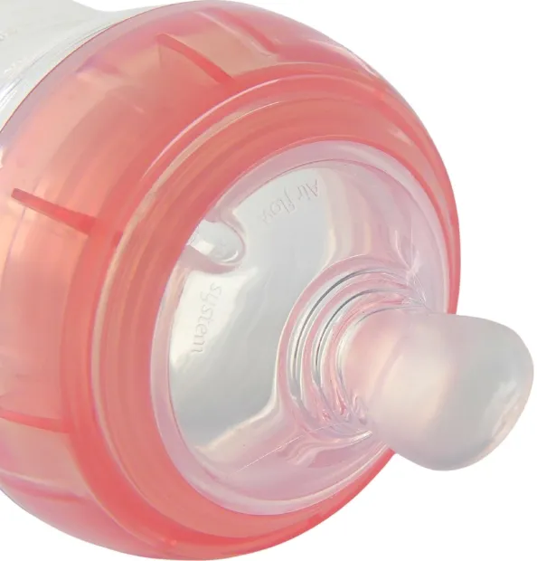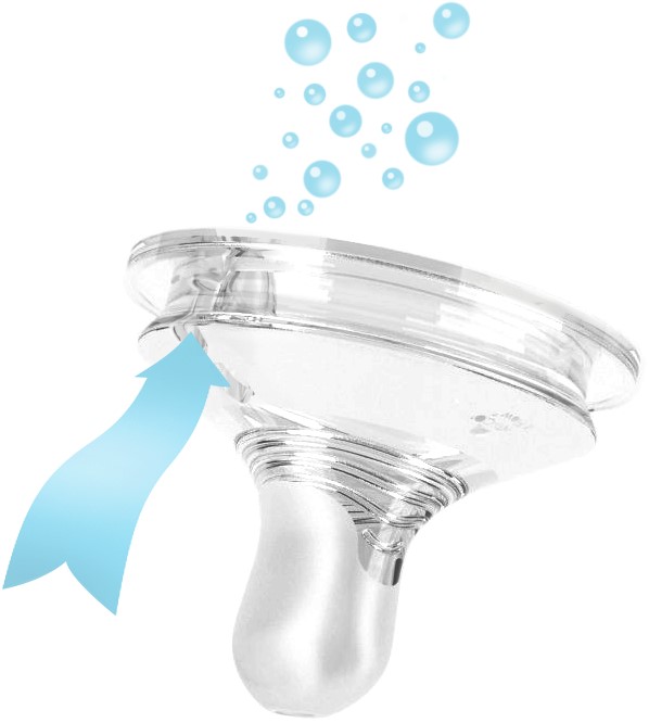 Esprit-flaskans dinapp är utformad för att stimulera naturlig amning direkt när barnet vidrör dinappen. Så fort flaskan är i matningsläge startar luften i luftkammaren den mjuka och konstanta ventileringsprocessen i nappflaskan. Dinappens unika ventil, med en mycket känslig öppnings/stängningsfunktion, ger jämnt flöde så att barnet sväljer mindre luft vilket förhindrar uppkomst av kolik. Dinappens kurvatur imiterar bröstets naturliga form, vilket underlättar i övergången från bröst- till flaskmatning.